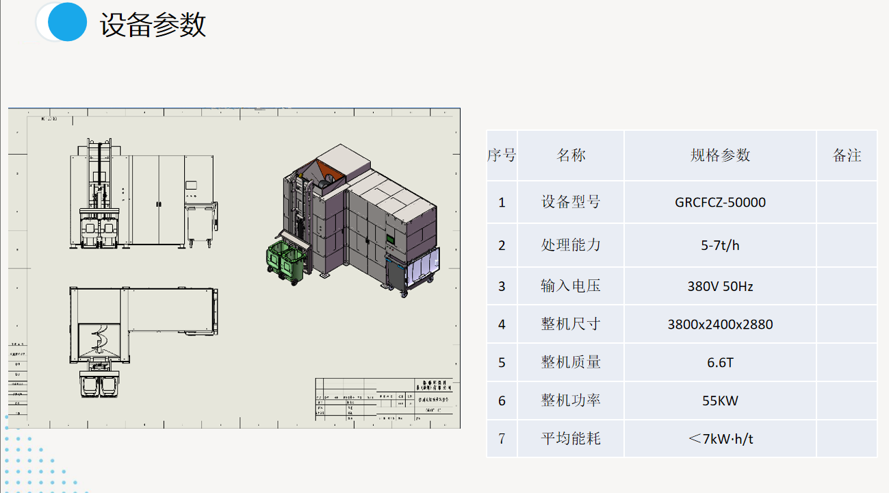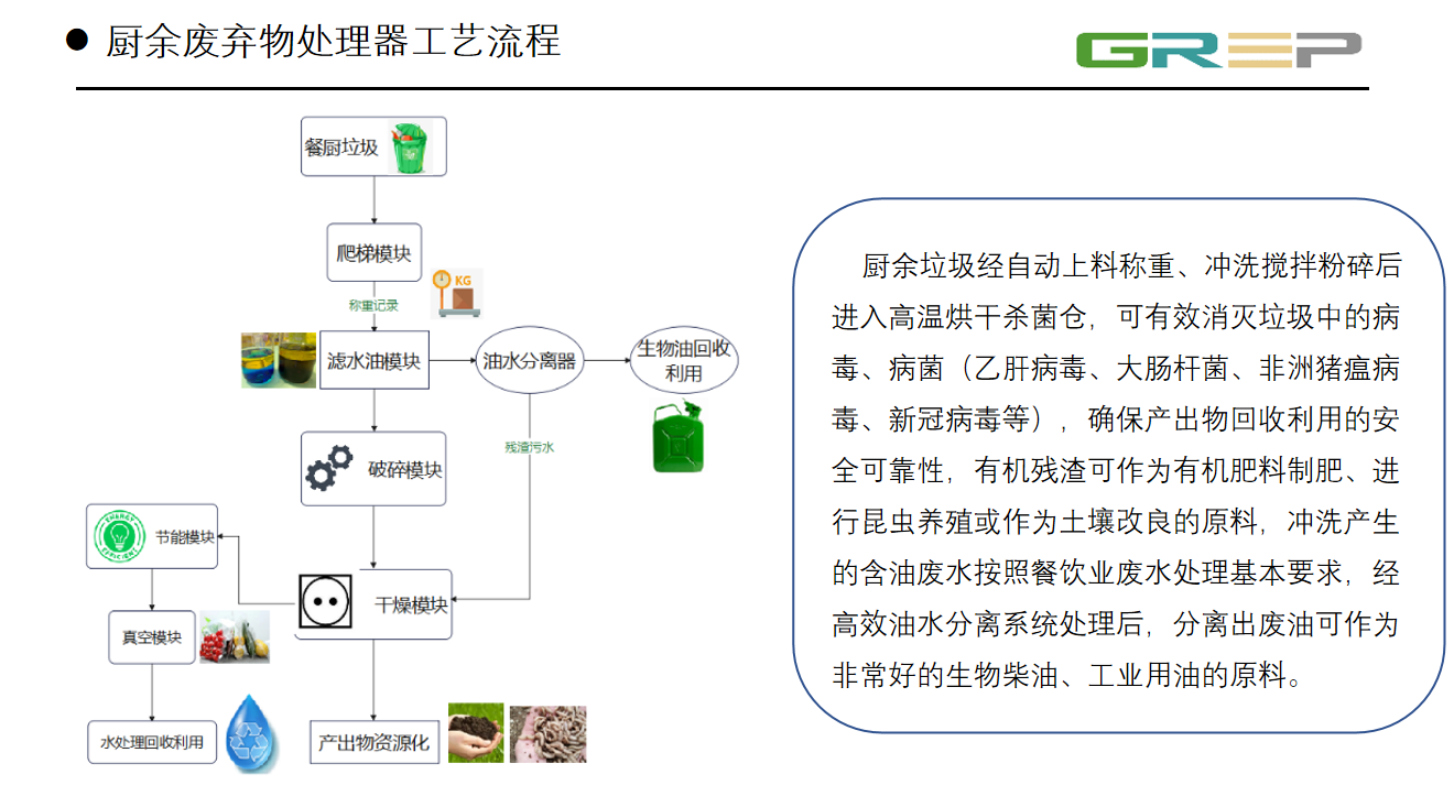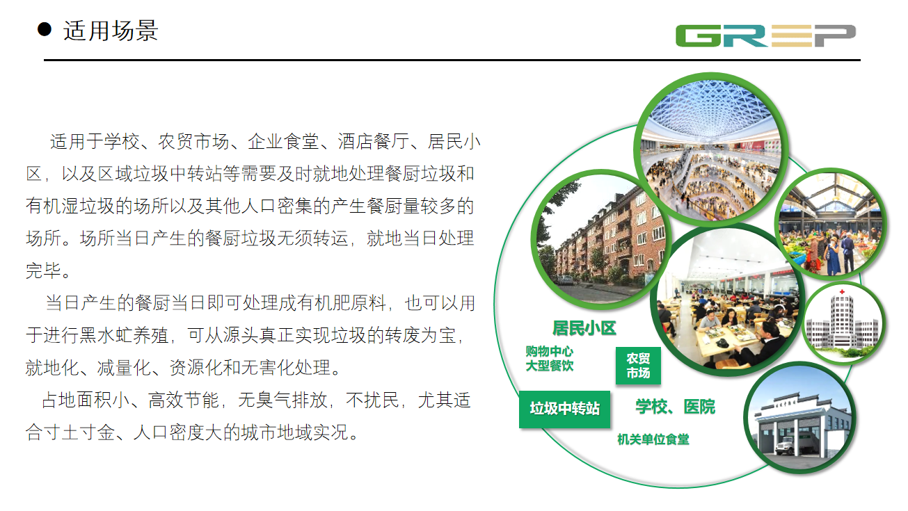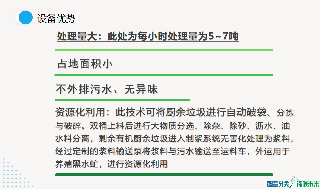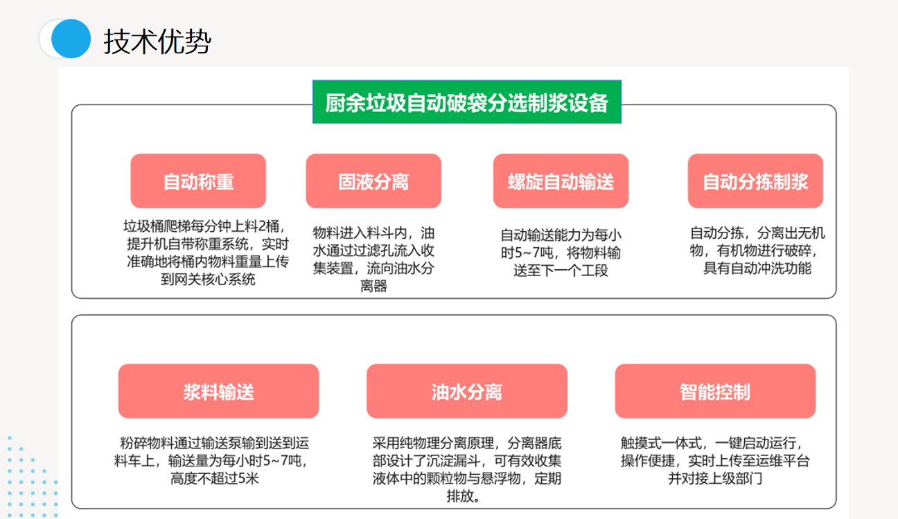 采用智能自动破袋分选技术将厨余处理为浆料;采用物理处理技术将厨余垃圾处理为饲料原料,无异味,无污水外排,适用于密集型居民区、机关单位等。